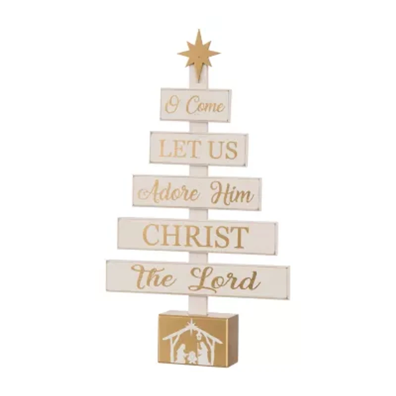 Start a journey through Christmas with a creative spirit this season! Nativity wooden table tree boasts a tree shaped table piece, featuring a lovely nativity scene on the golden base and a golden star on the top, and the sentiments in the same color to coordinate base and star on the planks saying, "o come let us adore him Christ the lord". It's ready to sit on your table to not only adorn your home but give you and your guest a special nativity holiday.