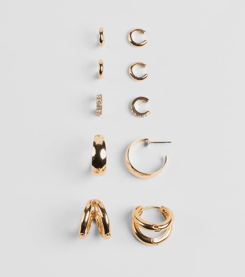 A five-pack hoop earrings set to glitz up every look! The pack features various styles and designs of hoops each with a post-back or omega closure. Pair with a handbag. Fit & Features Five-pack hoop earrings Various styles and designs Post-back closures Omega closure   Earrings are final sale and may not be returned or exchanged.
