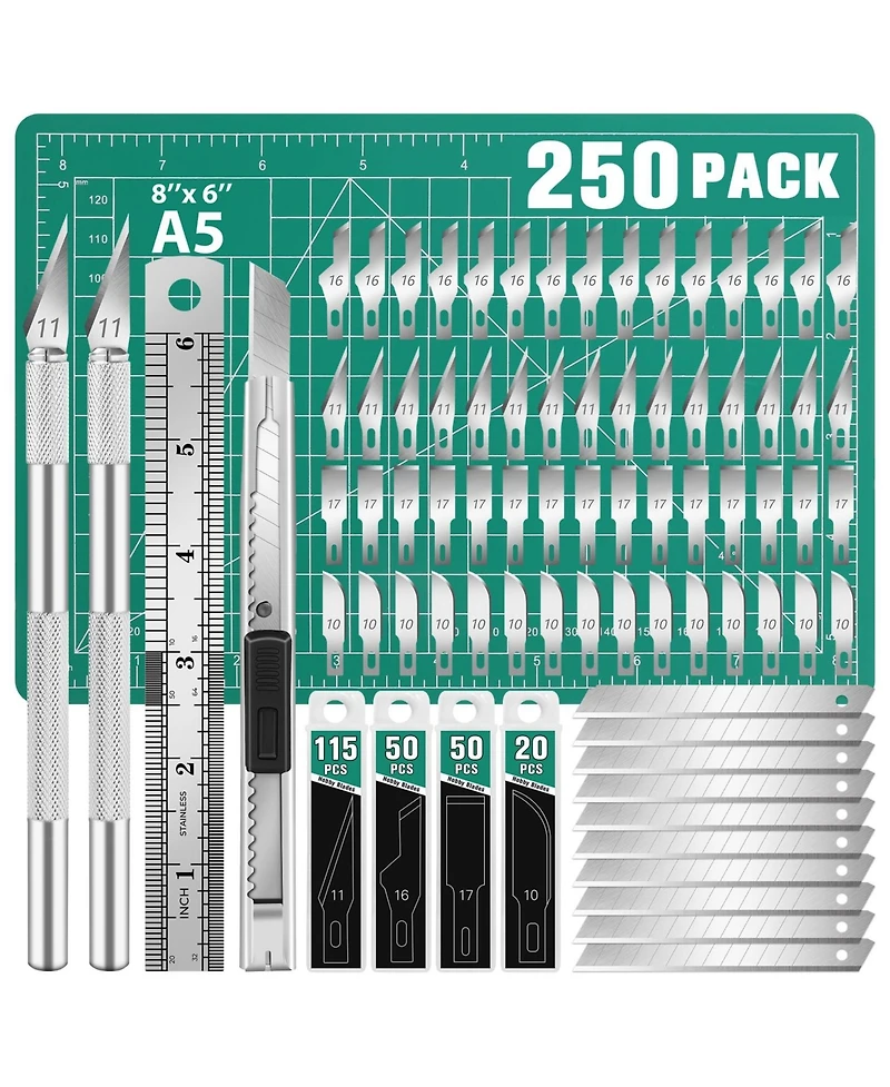 Valuable Package Content: 2pcs hobby knives, 115pcs #11 blades, 50pcs #16 blades, 50pcs #17 blades, 20pcs #10 blades, cutting mat, utility knife, 10pcs snap-off utility blades, steel ruler (6inch/15cm long). Precision and Control: The set includes durable blades ensuring precise and controlled cuts. The precision knives are designed for optimal grip and handling, allowing for intricate detailing and smooth carving motions. The blades are made from high-carbon steel, ensuring durability and long-lasting performance. Safety and Convenience: The set includes a mat that provides a stable surface for cutting. Each knife features a cap for safety. The 9mm utility knife features snap-off blades, allowing for easy and quick blade replacement.