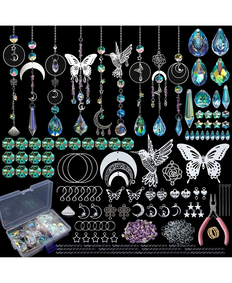 Diy Suncatcher Making Kits include 400pcs accessories for creating delicate hanging decorative sun catchers with crystals. The kit contains assorted crystal beads, crystal pendants, purple crystals, metal butterfly hummingbird rose decorations, moon stars and heart metal decor, plus tools. Everything needed in one box for adults crafts. Suitable for making hanging crystals decor as gifts for women for birthday, wedding, anniversaries, party, Mother's Day, Valentine's Day, Thanksgiving Day, Christmas. The colorful crystal prism feature bright Ab coating, carefully grinded and polished with smooth transparent surface to better refract sunlight and cast small rainbows. Perfect for home decor in kitchen, office, indoor windows, outdoor garden, doors, balcony, porch, car mirror, chandelier parts, Christmas tree and crystal art projects.