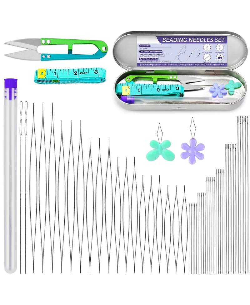 This set includes 60 long straight beading thread needles in 6 sizes (0.45 x 32mm, 40mm, 48mm, 55mm, 80mm, 100mm), 18 big eye seed bead needles in 6 sizes (4.5cm, 5.8cm, 7.6cm, 8.9cm, 10.2cm, 11.5cm), 2 twisted wire beading needles, 2 threaders, 1 tape measure, 1 yarn scissors, 1 bottle and 1 storage box. All needles are made of rust-resistant stainless steel, lightweight and durable. The ultra-fine needles work with beads smaller than 1mm holes. Suitable for Diy jewelry making including bracelets, necklaces and beading projects. Use the threader by passing thread through it first, then through the needle eye. Do not force bend or use on leather.