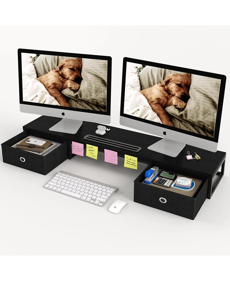 Space-Saving Dual Monitor Solution: 39-inch extra-long monitor riser supports two monitors, printer, or laptop combo, creating a streamlined workstation while freeing up desk space underneath. 2 Built-in Drawers and Integrated Slot: Two slide-out fabric drawers reduce clutter, with a built-in device slot for phone or tablet holder, keeping pens and office supplies within reach. Ergonomic Design: Raises screen to 5.7-inch eye level to correct posture and reduce neck, back, and eye strain. Heavy Duty Construction: High-quality Mdf wood supports up to 100 lbs, water-resistant black finish, non-slip rubber pads for stability. Easy Assembly: Complete in under 5 minutes with included hardware and manual. weight: 10.67 pounds.