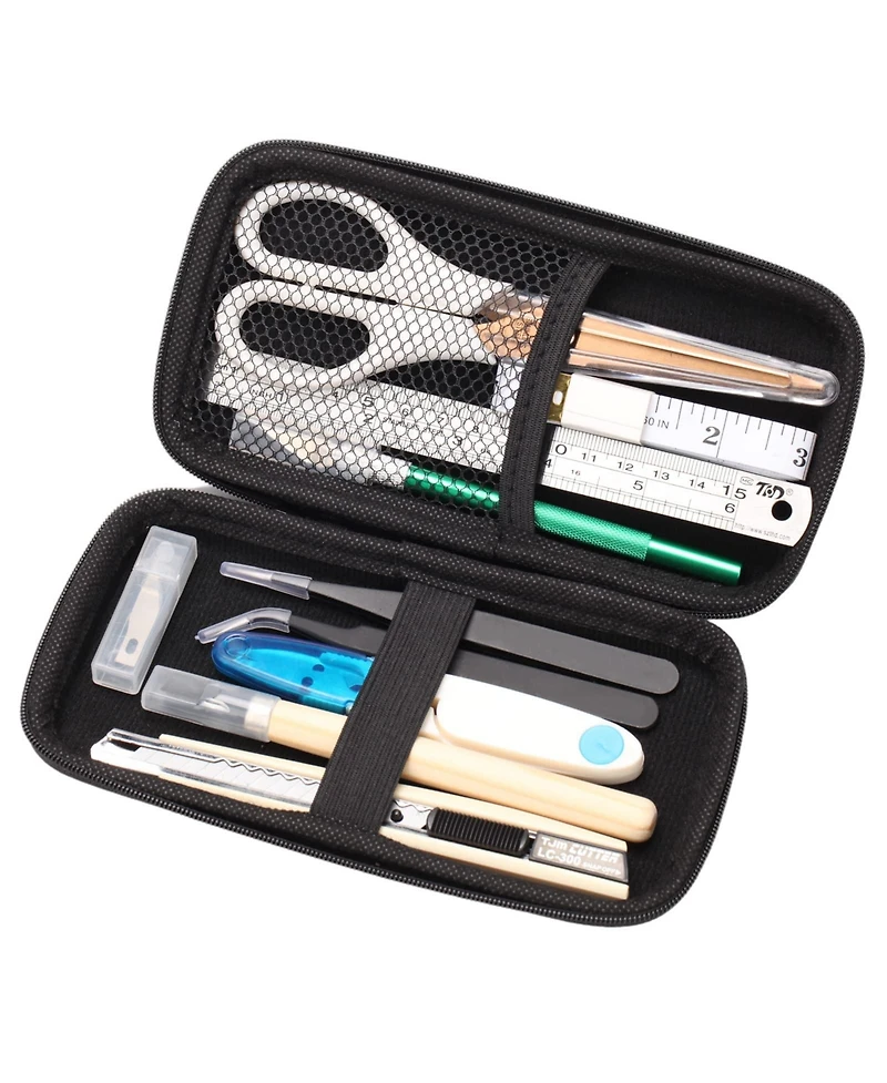 This 9-in-1 portable craft tool kit includes scissors, craft knife, ruler, sewing tape measure, folding utility knife, carving knife, tailor's scissors, and tweezers, designed for cutting, measuring, and detail work in offices and homes. Each tool is made of durable materials for reliable performance. The kit comes with an Eva storage bag for easy carrying and organization. Suitable for household tasks, office work, and various craft activities including sewing and cutting.