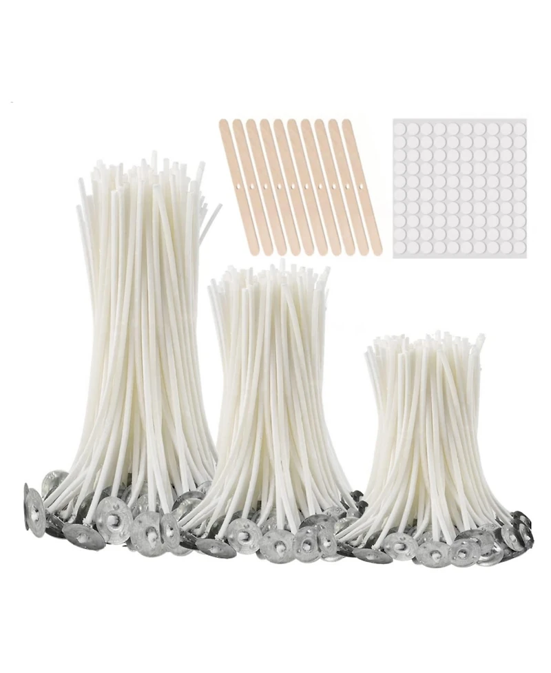 Value pack includes 3 sizes of cotton woven candle wicks: 4", 6", and 8", each with 100 pieces, plus 10 wooden wick fixators and 100 double-sided tapes. All wicks feature wax coating for easy use. Suitable for containers under 2.4 inches diameter larger containers require multiple wicks. Ideal for beginners and professionals making homemade candles. Note: avoid excessive dye and fragrance to maintain proper burning.