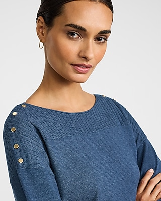 A lightweight sweater complete with ribbed details and gold hardware accents on the shoulder.