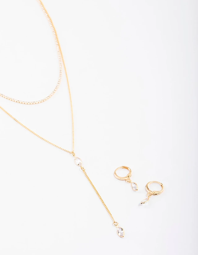 Gold Layered Y-Neck Necklace & Earrings Jewellery Set