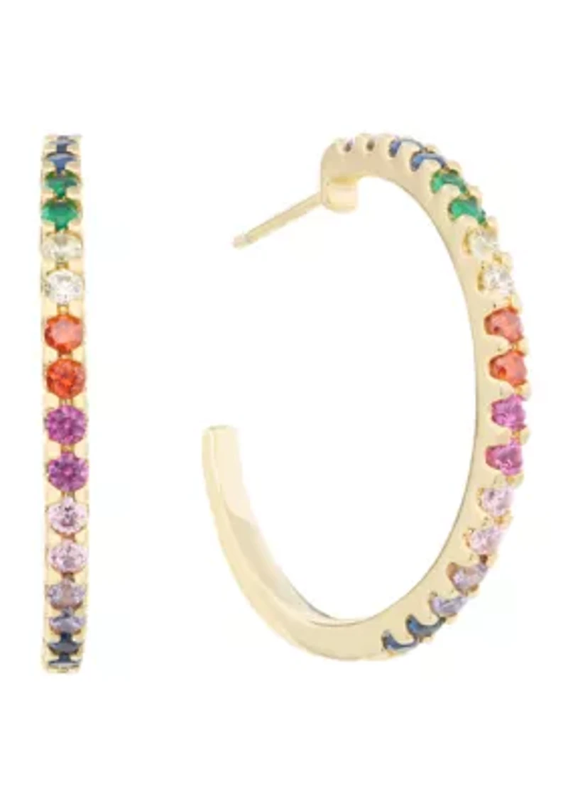 Color your world with Belk Sterling Silver's gold-plated rainbow cubic zirconia hoop earrings. The earrings are finished with a post backing for easy wear. Post back earring Polished finish Imported Belk Exclusive Product Specifications 1.12" L x 0.09" W Material & Care Gold-plated metal Clean with a soft cloth