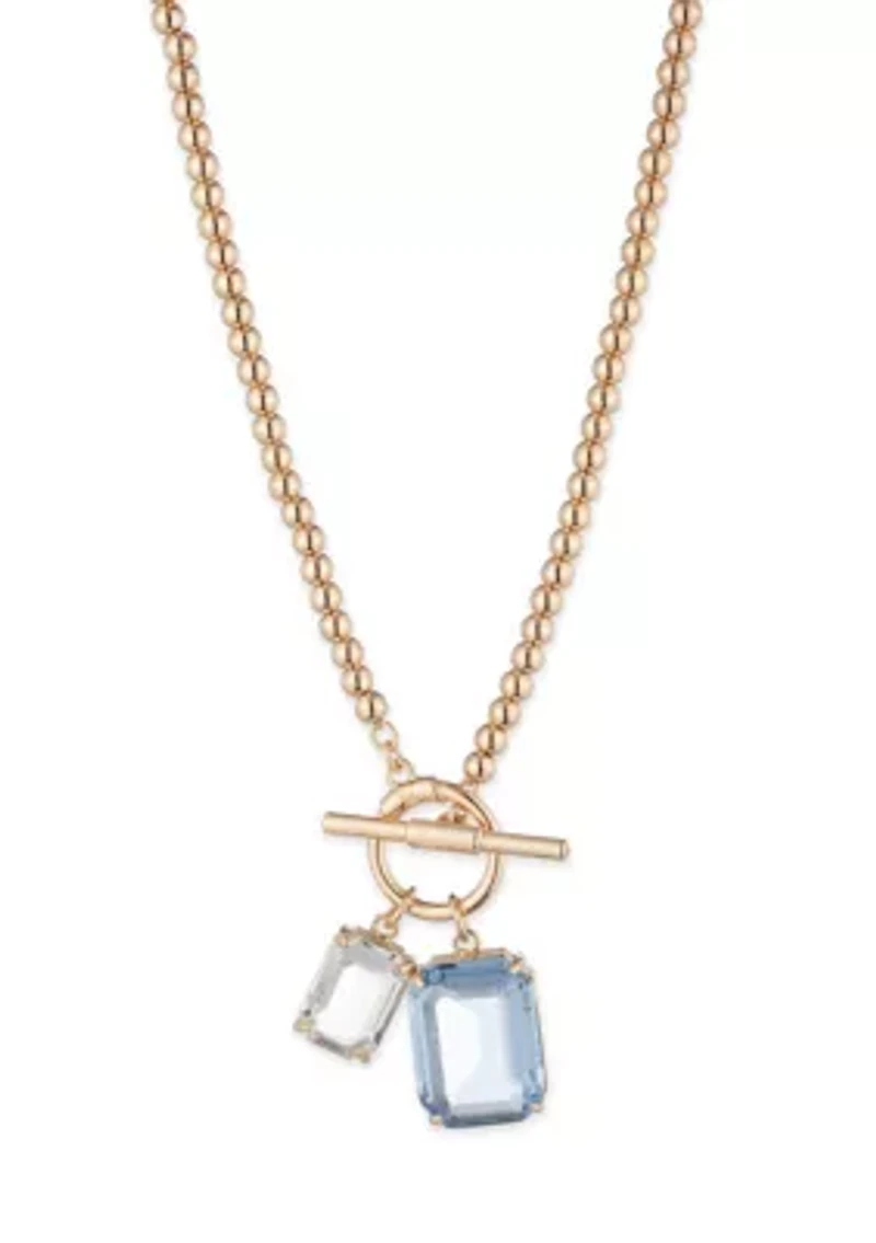 Elevate your style with this captivating pendant necklace. Its polished gold tone metal and alluring blue stone pendant add a touch of elegance to any outfit. The secure toggle closure ensures a comfortable fit, making it perfect for everyday wear or special occasions. This necklace will enhance your confidence and radiance. Toggle closure Polished finish Imported Product Specifications 16" L Material & Care Gold-tone metal Clean with a soft cloth