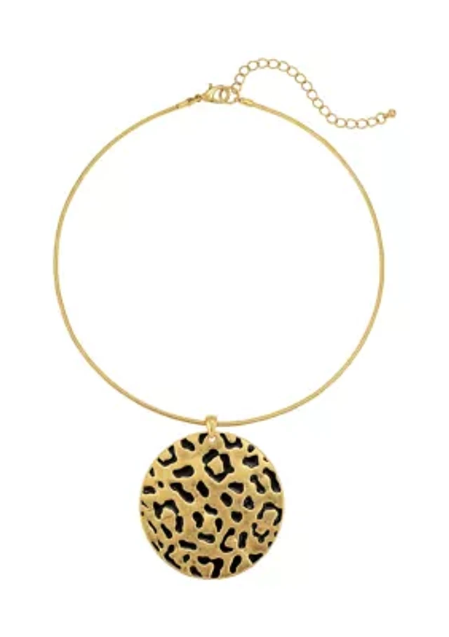 Gold-Tone Collar Neck Wire With Round Leopard Print Metal Pendant Drop Necklace