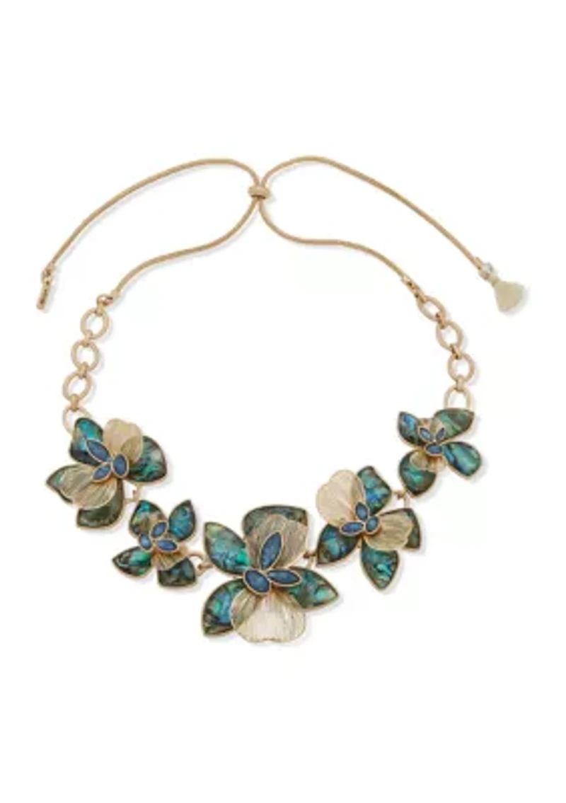 Blue and green flowers add elegance to this frontal necklace from Lonna & Lilly. Adjustable slider closure Polished finish Imported Product Specifications 26" L Material & Care Gold-tone metal Clean with a soft cloth