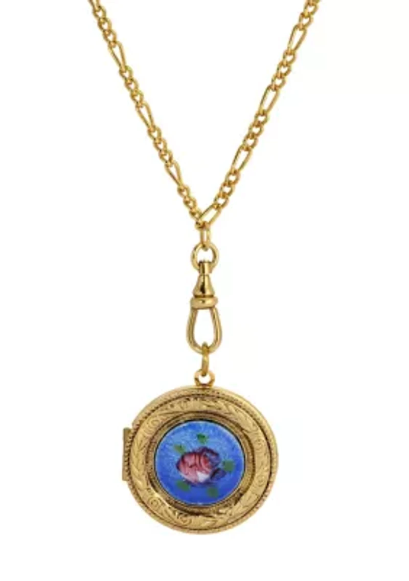 This 14k gold dipped locket necklace features an intricate circular pendant with ornate etchings and a vibrant enamel center showcasing a delicate pink rosebud motif. The pendant opens to reveal a polished inner compartment, perfect for holding a cherished photo or small keepsake. Paired with a classic chain and secure swivel clasp, it combines artistry and sentiment in an elegant vintage-inspired design. Lobster closure, 1 Polished finish USA Imported Product Specifications 28"L X 1.25"W X 2.25"H, 28" Material & Care Metal, Gold-tone metal Clean with a soft cloth.