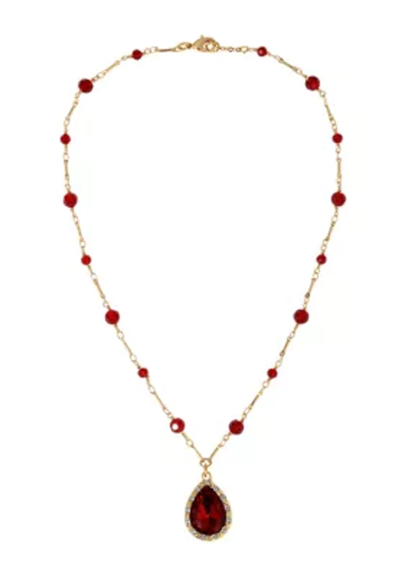 A strand of softly gleaming Siam red glass beads leads the eye to a richly hued Siam red teardrop pendant, its graceful silhouette evoking romance. The warm metal finish and jewel-toned drop create a striking contrast, lending the design a sense of vintage-inspired elegance that feels both timeless and refined, as if discovered in a treasured heirloom collection. Lobster closure, 1 Polished finish USA Imported Product Specifications 18"L X 1.3"W X .7"H, 18" Material & Care Metal, Gold-tone metal Clean with a soft cloth.