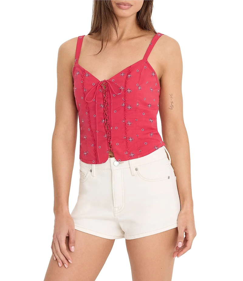From Good American, this tank features: Country glam, Dolly’s way. This stretch cotton poplin tank has corset-inspired detailing, a lace-up front, tailored darting and a classic paisley-inspired print that nods to her Southern roots. Cotton poplin fabrication Sweetheart neckline Thin straps Lace up front Invisible zipper on left side Darting down the front Southern paisley-inspired print 13.5" long from shoulder Cotton/spandex Machine wash cold with like colors on normal cycle Do not bleach Tumble dry on low heat Color may transfer when garment is new Imported.