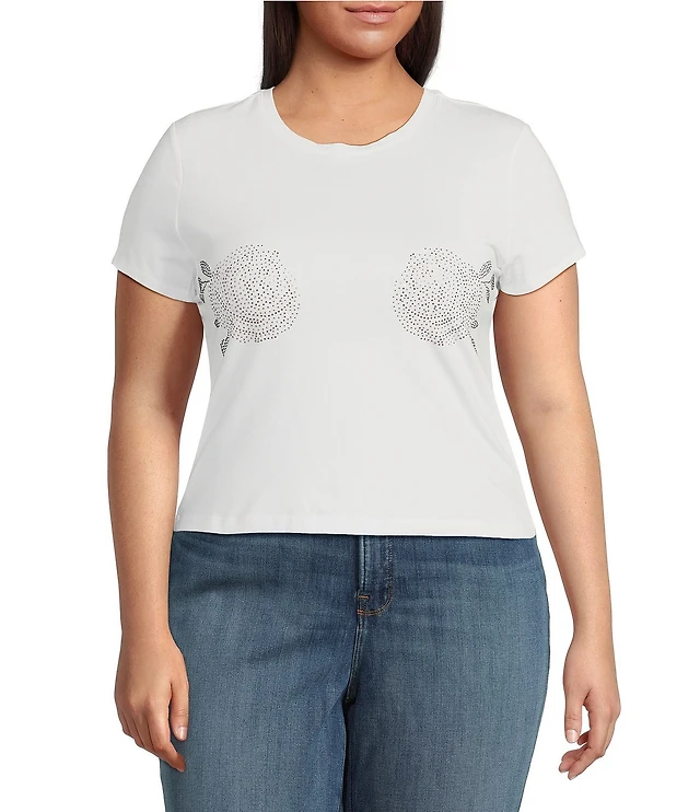 Good American Plus Size Crew Neck Short Sleeve Super Stretch Rhinestone Rose Baby Tee