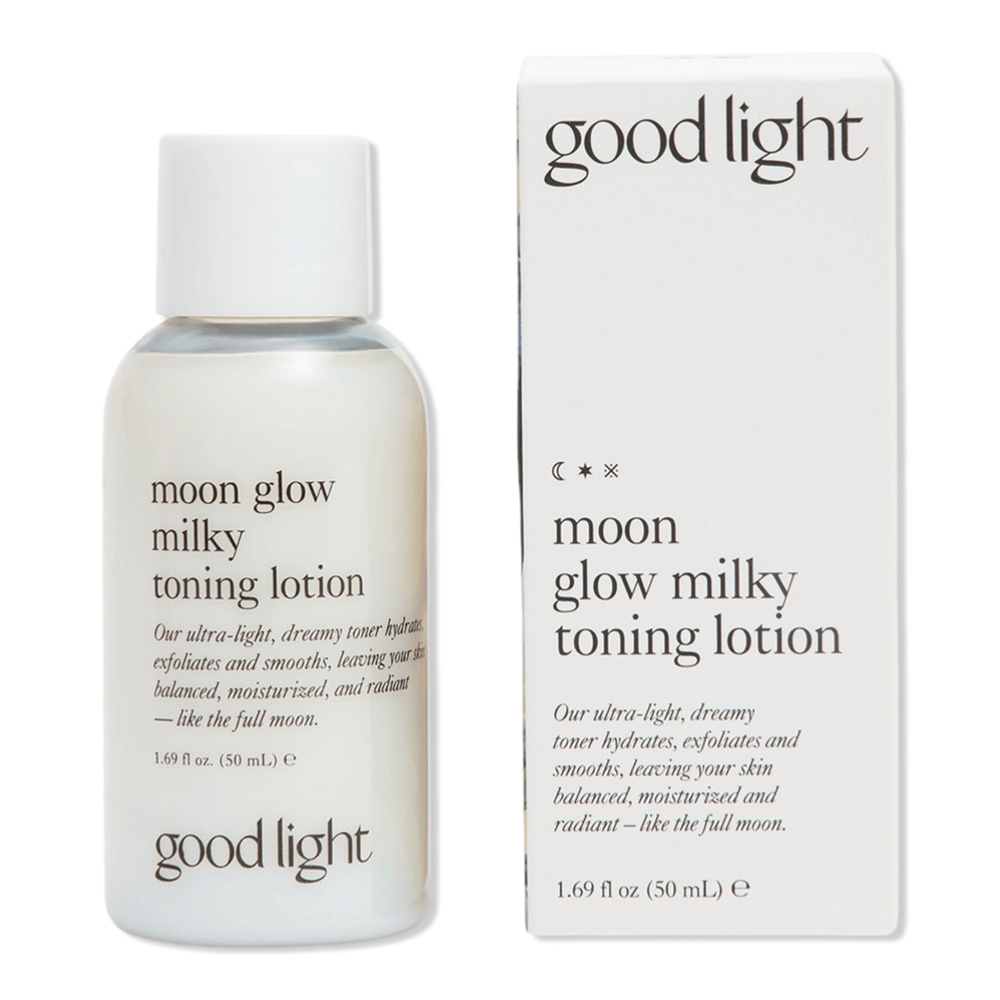 MOON GLOWING MILKY TONING LOTION 3.4FLOZ. Benefits: Super hydrating, nourishing, and soothing.. pH balanced. For all skin types. Gentle for sensitive skin. Features: good light is a personal care brand that believes in beauty beyond the binary, creating a new space in the market for those who don't quite shop beauty by gender.. Dermatologist tested. Key Ingredients: Meadowfoam Seed Oil: A fatty acid that hydrates and improves healing in compromised skin barrier function.. Snow Mushroom: Holds 1,000x its weight in water particles to penetrate and hydrate.. Niacinamide: A form of vitamin B3 that helps minimize pores, reduce redness, regulates oil, and helps reduce the appearance of sun damage.. Ceramides: Locks in moisture to protect from dryness and irritation..