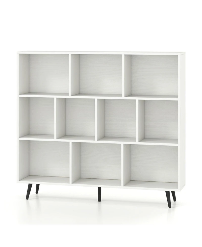 Ten spacious cubes supported by five tapered metal legs give this bookcase a mid-century modern profile while providing generous compartment storage for books, albums, and decorative bins. The elevated 4.5-inch clearance beneath the frame simplifies floor cleaning, and firm corner bracing reinforces the overall structure. Two anti-tipping safety kits anchor the unit to the wall, and non-slip pads on each leg protect flooring surfaces from scratches.