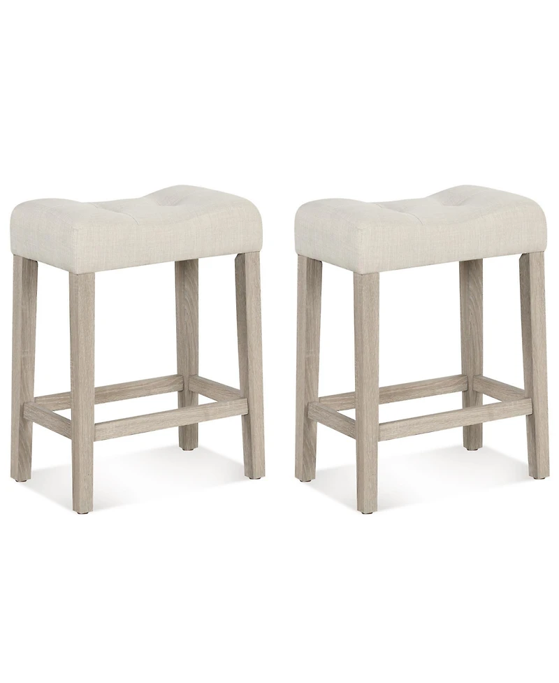 A generously curved saddle seat with tufted detailing defines the charm of these compact counter height bar stools, delivering cafe-inspired style to kitchens, breakfast nooks, and home bars. The 4.5 in thick cushion layered with wear-resistant fabric over dense sponge provides plush, sink-in comfort meal after meal. Premium rubber wood frames hold up to 330 lbs per stool, while non-slip leg pads keep each stool anchored and floors protected.