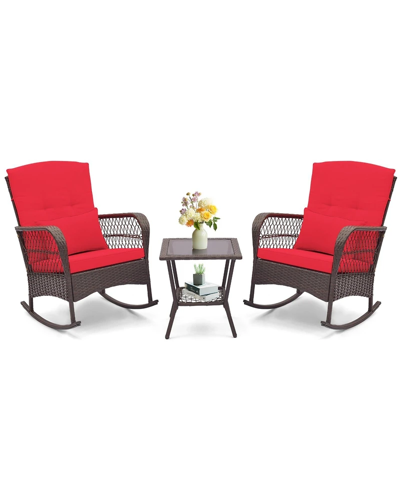 Elevate your outdoor relaxation with this stylish 3-piece wicker rocking set. Featuring two gentle rocking chairs with cozy cushions and a double-tier coffee table, this set offers a perfect spot to unwind, enjoy a drink, or read a book on your patio or porch.