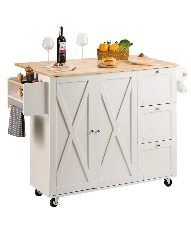 Perfect for busy kitchens and commercial settings, this kitchen island cart combines generous countertop space with versatile storage solutions for kitchens of any size. The fold-down drop leaf extension expands your work surface when needed and tucks away to save space in smaller layouts. Equipped with drawers, cabinets, and open shelving, it keeps cookware and pantry items neatly organized. Lockable swivel casters provide easy mobility.