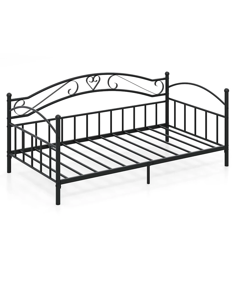 Serving as a versatile sofa during the day and a comfortable bed at night, this twin size metal daybed features an elegant scrollwork headboard that adds decorative character to bedrooms, living areas, and guest rooms. Twelve powder-coated metal slats with a middle support leg handle up to 485 lbs, providing stable mattress support without a box spring.