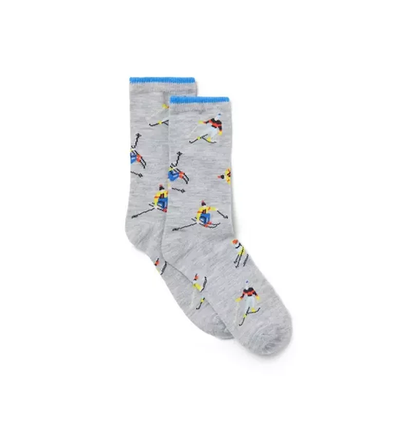 Ski trip style for any adventure with our limited edition sock. Featuring intarsia-knit skiers and a ribbed cuff. 41% Polyester/35% Nylon/22% Cotton/2% Spandex Textured Grips (Sizes Up To 12-24M) Machine Washable; Imported