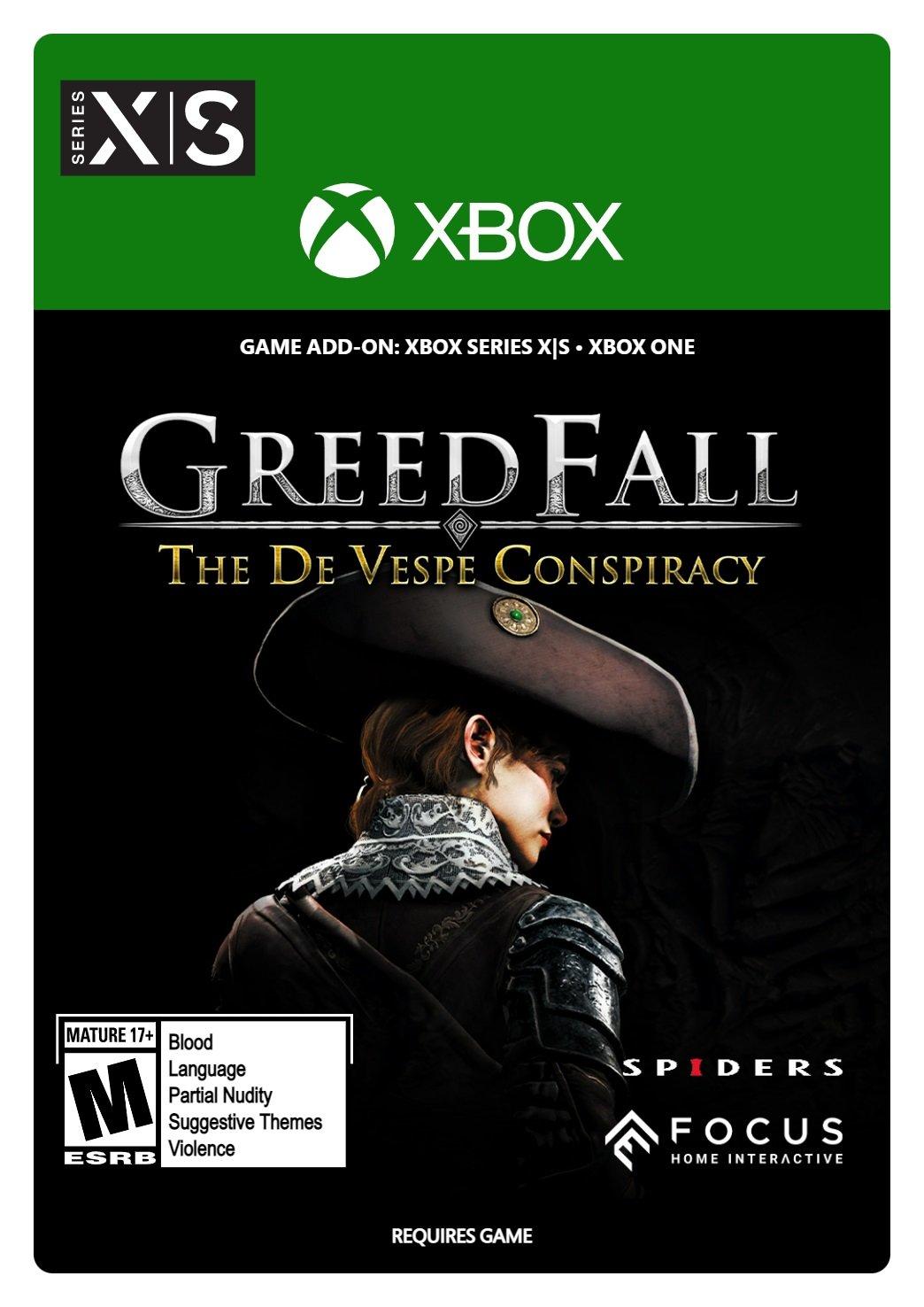 Explore a new region on Teer Fradee, facing unfamiliar foes as you navigate a web of intrigue and unravel the de Vespe conspiracy. GreedFall - The De Vespe Conspiracy expansion on Xbox brings new enemies and gear with a twisting narrative that expands on GreedFall’s acclaimed story. Expand GreedFall’s RPG adventure with The de Vespe Conspiracy expansion, and discover a brand-new storyline on the island of Teer Fradee. Navigate a web of intrigue, manipulation and secrets, as you unravel a nefarious conspiracy that threatens the balance of power. Explore a previously-undiscovered region of the island, battle strange new beasts and face off against a villainous new enemy faction in your hunt to uncover the truth. This expansion brings a new region, enemy types, costumes, weapons and contracts, with a twisting narrative that expands on GreedFall's acclaimed story.