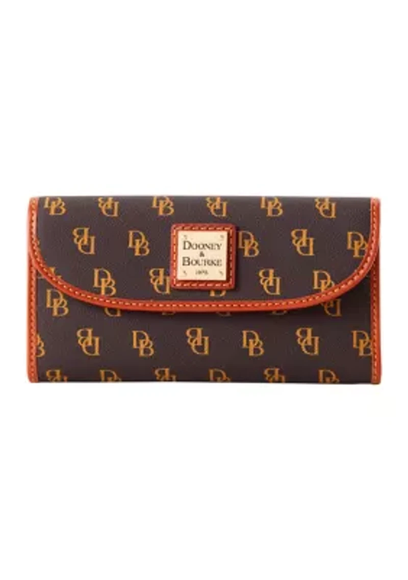 The Gretta Signature continental clutch features a coated cotton bag with coordinating signature logos. Snap closure Exterior: zip pocket Interior: seven credit card slots, license pocket with window, three pockets Imported Product Specifications 7 in x 0.75 in x 3.75 in Material & Care Leather trim Cotton Clean with a soft cloth