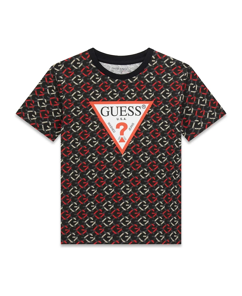 Let his personality shine in this all-over print short-sleeve T-shirt from Guess, featuring a vibrant design and screen print triangle. The crewneck and regular sleeves offer a comfortable, casual fit for daily adventures.