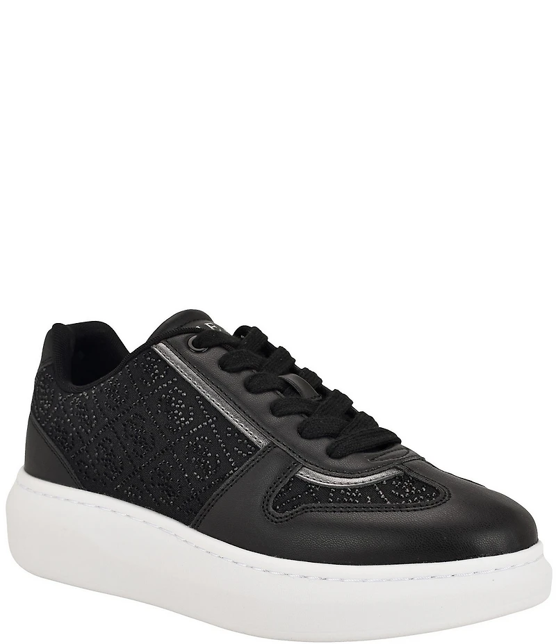 From Guess, the Fhilip Rhinestone Logo Embellished Platform Sneakers feature: Rhinestone logo embellished fabric upper Synthetic trim Adjustable ace up front closure Fabric lining Synthetic outsole Approx. 1.25" platform height Imported.