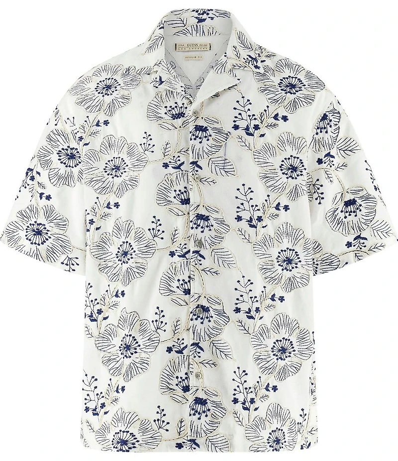 From Guess, this shirt features: Allover embroidery detailing Spread collar Short sleeves Button-front closure Straight hem Polyester/viscose/rayon/cotton Machine wash/tumble dry Imported.