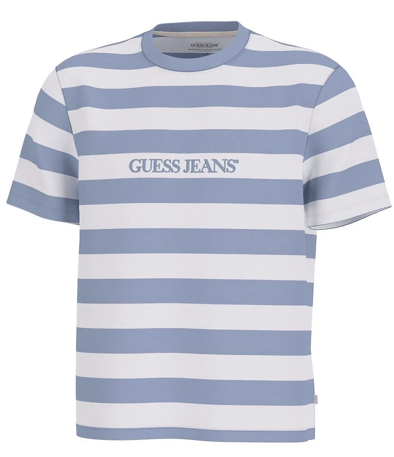 From Guess, this t-shirt features: Striped design Crew neckline Short sleeves "Guess Jeans" lettering on the center front Straight hem Pullover styling Yarn-dyed organic cotton Machine wash Imported.