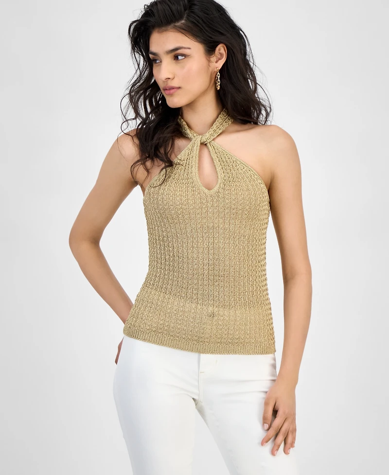 A subtle metallic finish lends an elevated feel to this flawless halter top by Guess, showcasing a twisted halter neck for an extra touch of elegance.