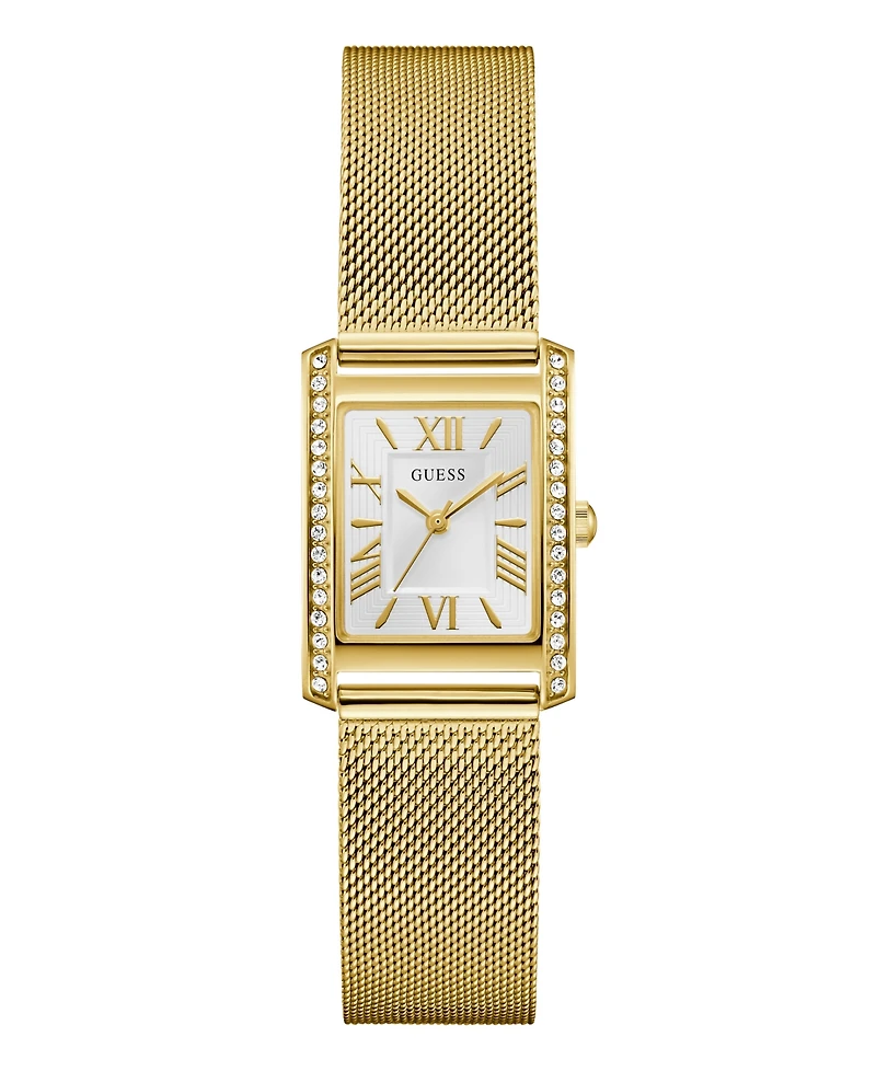 This slim rectangular silhouette pairs a polished gold-tone Stainless-steel case with a white sunray dial for a crisp and refined look. Crystals on the bezel adds just the right sparkle, while the gold-tone steel mesh bracelet delivers a smooth, flexible drape that feels as good as it looks. Clean lines and a radiant finish give it an unmistakable shine.