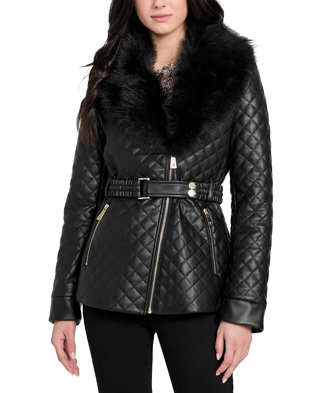 Guess Women's Quilted Faux-Fur-Collar Faux-Leather Jacket