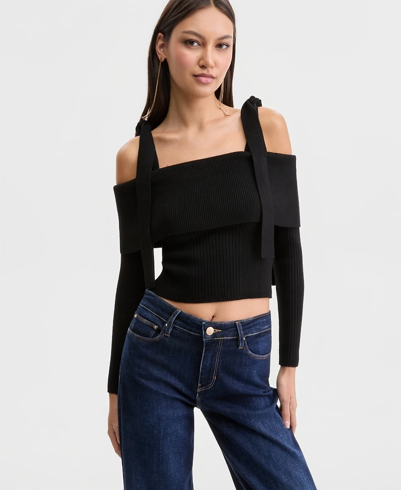 Flirty and refined, Guess' off-the-shoulder top features tied shoulder straps to keep this chic piece in place all day and night.