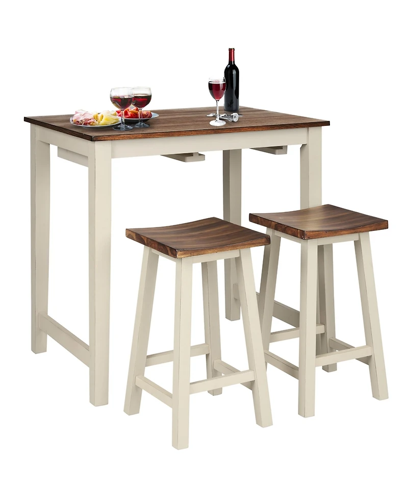 Add a touch of simple elegance to your space with our 3-piece Kitchen Dining Table Set!This 3-piece pub dining table set contains 1 counter height pub table and 2 stools with curved surface and comfortable footrest that can provide luxurious sitting without too much fatigue even sitting for a long time. You can simply hang the stool underneath the table with slid-in rails. It is beneficial for small spaces with a small footprint. Premium Mdf and rubber wood construction promises an excellent stability with high weight capacity to use longer. It is a good choice for living room, kitchen, restaurants, pubs or breakfast nooks. Features:3-piece table set includes 1 table and 2 stoolsHang the stool under the table to create extra space when needed. Create your own pub or bistro area with attractive classic and stylish look. Sturdy cross bars installed on each side for reinforced stability