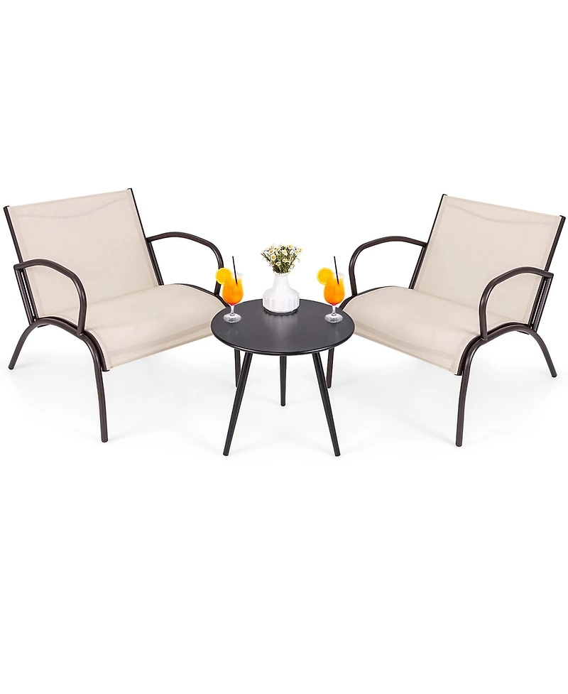 Gymax 3 Piece Patio Chair Set Curved Fabric Seat Round Coffee Table for Backyard
