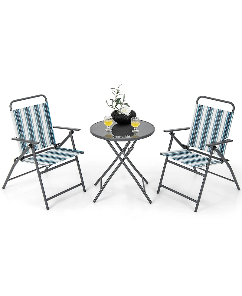 Our 3 pieces patio folding chair set consists of a tempered glass top table and 2 folding chairs. The table base features 4 claw X-shaped legs, which makes it sturdy and steady. The folding chairs are made of breathable seat and back fabric and metal frame, highly fade-resistant, tear-proof, and stable for long-term use. Featuring wide sitting area, high backrest, and armrests in a suitable height, the chairs make you more comfortable for relaxation. An ideal way to enjoy a cafe-style experience right outside your own door!Features:Stable and sturdy frame with reinforced fixing device for enhanced support. Breathable fabric is easy to dry, wear-resistant, and anti-fading, Folding Design for easy transportation and storage, saving space for you, Comfortable armrest and spacious seats provide an excellent seating experience, Table with black tempered glass top and X-shaped structure for stability.