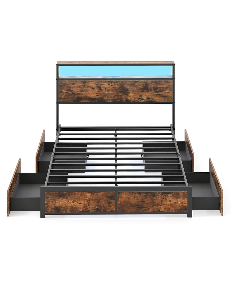 Gymax Full Size Led Bed Frame with 2-Tier Storage Headboard and 4 Drawers Charging Station