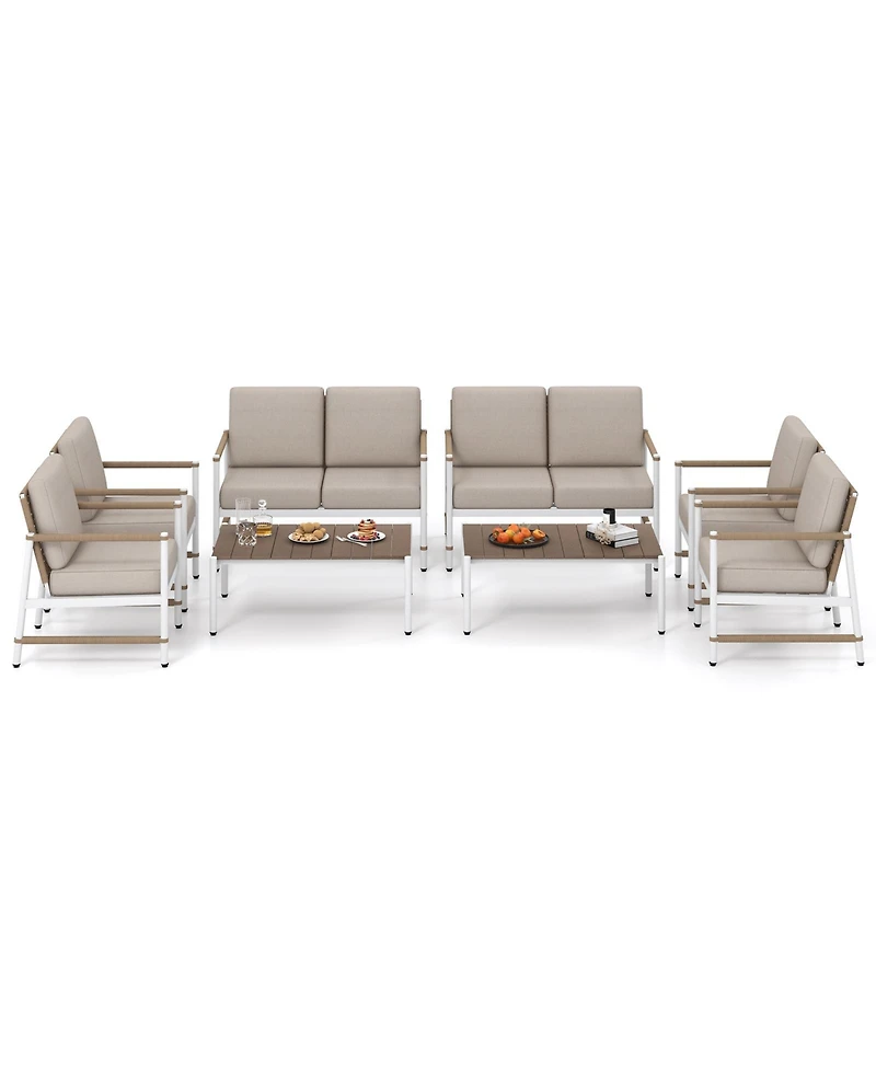 Elevate your outdoor gatherings with our 8-piece aluminum conversation set! This set includes 4 comfortable single sofas, 2 cozy loveseat, and 2 stylish table, all designed to withstand the elements with durable aluminum frames, non-slip foot pads, and elegant woven Pe rattan accents. The plush 5'' thick cushions and ergonomic backrests on the loveseat and chairs provide a cozy seating experience while you enjoy company. The coffee table features an easy-to-clean surface, perfect for holding drinks. The removable cushion covers make maintenance a breeze. Whether on your patio, deck, yard, or poolside, this modern and functional set is sure to spruce up your outdoor space.Features:8-piece patio conversation set includes 2 table, 4 single sofas, and 2 loveseat sofaSturdy aluminum frames are rust-resistant and lightweightSlatted Pe tabletop is easy to clean and prevents water pooling