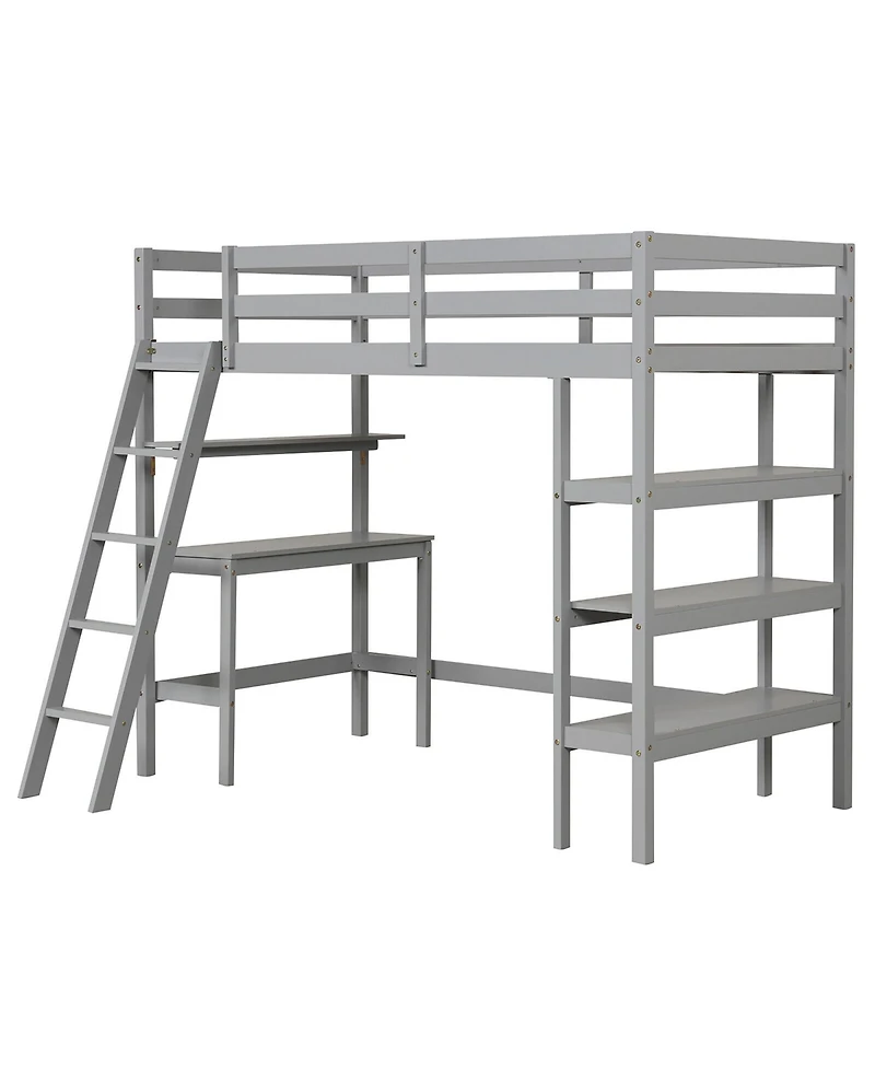 The twin loft bed with desk and bookshelves not only serves as a comfortable sleeping area but also double as a space for your kids to play and study. Composed of solid wood frame and premium wooden slats, the bed frame features exceptional stability and durability. The built-in desk offers a convenient workspace, making it ideal for studying, working, or gaming. Additionally, the shelves integrated to the bed provide versatile storage options for books, toys, and crafts. More, full-length guardrails prevent little ones from accidental falls while the integrated ladder makes it easy to climb to the upper bed. This modern loft bed is a perfect addition to kid's room, dormitory and apartments.Features:Solid wood loft bed ensures stable and sturdy sleeping areaSturdy wooden slats provide enhanced supportThe included desk gives your kid a dedicated study area