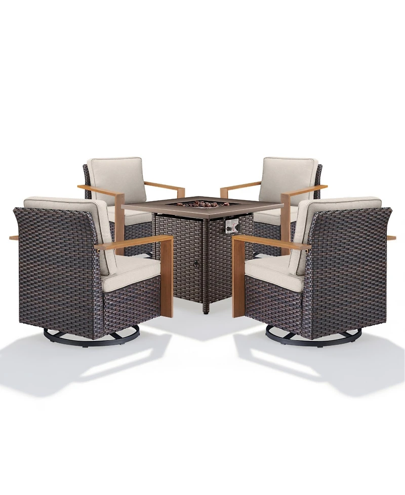 Gymojoy 5-piece patio set with 4 swivel rattan chairs, thick cushions, and a 30-inch propane fire pit table for cozy outdoor gatherings.