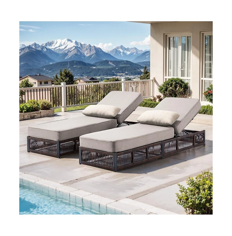 The Gymojoy Brown Wicker Outdoor Chaise Lounge Set is designed to create a comfortable and stylish outdoor relaxation area for patios, sunrooms, and backyard spaces. This 2-piece lounge chair set is crafted with weather-resistant Pe wicker that delivers a natural rattan appearance while offering durability for outdoor living. Supported by a sturdy powder-coated metal frame, each chaise provides reliable stability and long-lasting performance for everyday use. The included 5-inch thick Olefin cushions offer plush comfort and supportive seating, making these lounge chairs ideal for sunbathing, reading, or relaxing outdoors. The breathable Olefin fabric is suitable for outdoor environments and helps maintain comfort during extended lounging sessions. Perfect for pairing with patio side tables, outdoor coffee tables, or conversation sets, this wicker chaise lounge set enhances poolside, garden, and patio spaces with both function and modern outdoor style.