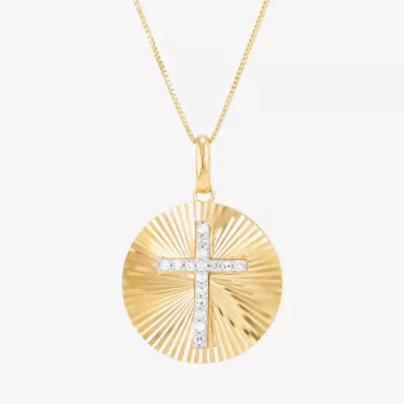 This stunning Cross pendant necklace for women is crafted in polished 14K yellow gold. Featuring 16 round-cut, Lab Grown white diamonds in a prong setting, it has a solid, box chain and is secured with a spring ring clasp.