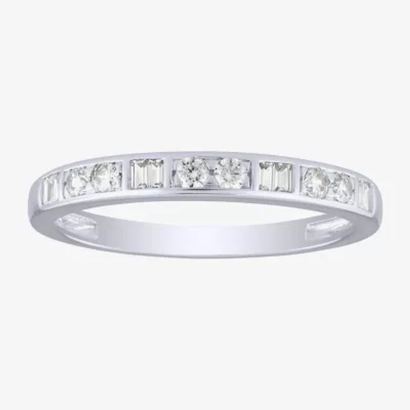 This wedding band has a contemporary look and feel and a sophisticated edge. Crafted from 10K White Gold, it comes with alternating baguette and round-cut sparkling Lab-Grown Diamonds in a channel setting.