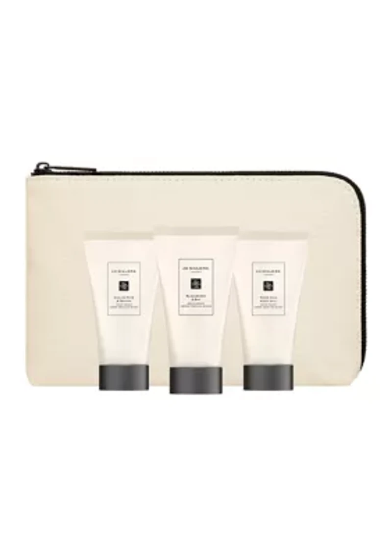 A luxurious miniature Hand Cream Collection. Encased in exclusive, London-inspired designs. Hand-illustrated by celebrated British artist Helen Beard. Infused with our most-loved scents. Tantalising Lime Basil & Mandarin. Mellow English Pear & Freesia. Opulent Peony & Blush Suede. Lightweight. Easily absorbed. Apricot kernel oil helps nourish and protect. Drenching hands in moisture. GIFT SET INCLUDES: English Pear & Freesia Hand Cream, 1 oz.; Blackberry & Bay Hand Cream, 1 oz.; Wood Sage & Sea Salt Hand Cream, 1 oz.; Pouch Massage a small amount into hands to hydrate your skin. Apply throughout the day as needed. Ingredients: Water\Aqua\Eau, Butylene Glycol, Coco-Caprylate/Caprate, Stearic Acid, Prunus Armeniaca (Apricot) Kernel Oil, Ethylhexyl Palmitate, Glycerin, Tocopheryl Acetate, Hydrogenated Polyisobutene, Cetyl Alcohol, Dimethicone, Fragrance (Parfum), Acetyl Glucosamine, Salvia Sclarea (Clary) Extract, Butyrospermum Parkii (Shea Butter), Persea Gratissima (Avocado) Oil, Caffeine, Cholesterol, Ethylhexylglycerin, Trehalose, Linoleic Acid, Sucrose, Carbomer, Sorbitan Stearate, Sodium Hyaluronate, Potassium Hydroxide, Hydrogenated Lecithin, Disodium Edta, Limonene, Benzyl Benzoate, Butylphenyl Methylpropional, Geraniol, Linalool, Citronellol, Citral, Farnesol, Sodium Dehydroacetate, Phenoxyethanol Rds Product Name: Peony & Blush Suede Hand Creme Division: Jm (Jo Malone)Ingredients: Water\Aqua\Eau, Butylene Glycol, Coco-Caprylate/Caprate, Stearic Acid, Prunus Armeniaca (Apricot) Kernel Oil, Ethylhexyl Palmitate, Glycerin, Tocopheryl Acetate, Hydrogenated Polyisobutene, Cetyl Alcohol, Dimethicone, Fragrance (Parfum), Acetyl Glucosamine, Salvia Sclarea (Clary) Extract, Butyrospermum Parkii (Shea Butter), Persea Gratissima (Avocado) Oil, Caffeine, Sucrose, Cholesterol, Sodium Hyaluronate, Linoleic Acid, Trehalose, Ethylhexylglycerin, Carbomer, Sorbitan Stearate, Hydrogenated Lecithin, Potassium Hydroxide, Alcohol Denat., Disodium Edta, Alpha-Isomethyl Ionone, Benzyl Alcohol, Geraniol, Citronellol, Benzyl Salicylate, Hydroxycitronellal, Linalool, Eugenol, Cinnamyl Alcohol, Sodium Dehydroacetate, Phenoxyethanol Rds Product Name: Lime Basil & Mandarin Hand Creme Division: Jm (Jo Malone)Ingredients: Water\Aqua\Eau, Butylene Glycol, Coco-Caprylate/Caprate, Stearic Acid, Prunus Armeniaca (Apricot) Kernel Oil, Ethylhexyl Palmitate, Glycerin, Tocopheryl Acetate, Hydrogenated Polyisobutene, Cetyl Alcohol, Dimethicone, Acetyl Glucosamine, Fragrance (Parfum), Butyrospermum Parkii (Shea Butter), Cholesterol, Sucrose, Caffeine, Salvia Sclarea (Clary) Extract, Persea Gratissima (Avocado) Oil, Sodium Hyaluronate, Trehalose, Hydrogenated Lecithin, Ethylhexylglycerin, Sorbitan Stearate, Linoleic Acid, Carbomer, Potassium Hydroxide, Disodium Edta, Limonene, Butylphenyl Methylpropional, Linalool, Hydroxycitronellal, Alpha-Isomethyl Ionone, Citral, Evernia Prunastri (Oakmoss) Extract, Geraniol, Amyl Cinnamal, Sodium Dehydroacetate, Phenoxyethanol Please be aware that ingredient lists may change or vary from time to time. Please refer to the ingredient list on the product package you receive for the most up-to-date list of ingredients. Imported