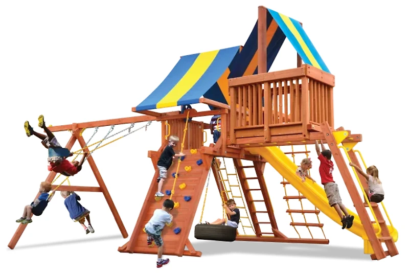 SUPREME best describes the newest addition to the Playground One lineup! This Supreme Playcenter Combo 4 has it all and then some at a price that even the most discriminating play set shopper will appreciate. Showcasing 4" x 6" heavy duty construction, a 6.5' high play deck with a 13' super slide, Monkey Bars, Sky