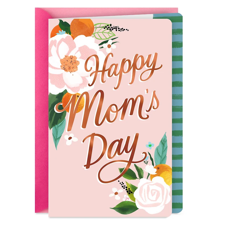 Mother's Day greeting card features an illustration of flowers and oranges on a pretty pink background paired with a warm message perfect for sharing with any mom. Foil accents with die-cut edge details.