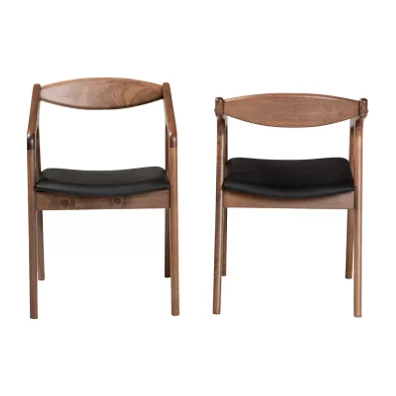 Bring retro-inspired design to your home with the stunning Harland dining chair. Made in Malaysia, the Harland features a walnut brown finished wood frame that projects visual warmth into any space. The plush cushion is padded with soft foam and upholstered in smooth faux leather for lavish comfort with every meal. Requiring assembly, the angled legs of the Harland extend to form ergonomic armrests for added comfort. Tasteful and comfortable, the Harland dining chair is sure to enhance any dining occasion. Dimensions: 29.5" High x 19.7" Wide x 21.9" Deep; Seat Dimensions: 18.1" High(From Floor) x 17.7" Wide x 18.9" Deep; Arm: 24.6" High; Legs: 17.1" High; Back: 29.5" High;
