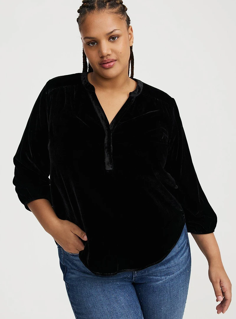 FIT Flowy silhouette. Measures 30'' from shoulder (size 2). MATERIALS + CARE Velvet woven fabric. Stretch level: Minimum. 75% viscose, 25% nylon. Machine wash cold. Dry flat. Imported. DETAILS Split neckline with button placket. 3/4 blouson sleeves. Shirttail hem. WHY WE LOVE IT Versatile and comfortable, this flattering pullover is easy to dress up or down for your comfiest and most elevated days.